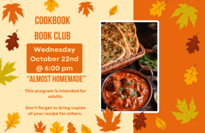 This month’s theme is “Almost Homemade”, recipes that use pre-made or store-bought convenience foods, which are then combined with a few fresh ingredients to save time and effort. This program is intended for adults. Bring your favorite cookbook, recipe card or internet suggestion and make a dish to share. The Library will have plates / bowls, plastic ware and napkins, but you must bring your own serving utensils. This program is intended for adults, don’t forget to bring in copies of your recipe for others!