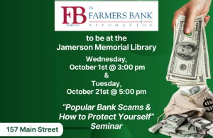 Farmers Bank of Appomattox will be in the Jamerson Library’s community room starting at 5:00pm for a “Popular Bank Scams & How to Protect Yourself” seminar. We encourage anyone with a bank account to attend.