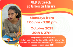 Doriane Mills from the Adult Learning Center will be at the Library to answer your questions and help you sign-up for classes to earn your GED.