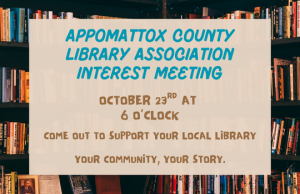 The Appomattox County Library Association (ACLA) will have its first meeting to reactivate this important 501(c)(3) friends of the library-style organization. If you are interested in supporting your local library, we encourage you to attend.