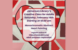 February 14th, Saturday – Jamerson Library’s Creative Class for Adults starting at 10:00 am in the community room. This month’s theme will be monochromatic abstract painting. You must be pre-registered to attend as space and supplies are limited. You can register online at: https://www.jrjml.org/adult-program-registration/.