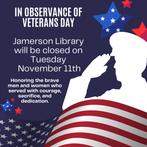 In observation of Veterans Day, the Library will be closed on Tuesday, November 11th. We will reopen for normal business hours on Wednesday, November 12th, starting at 9:30 am. The book drop, located at the back of the building, will remain open.