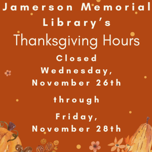 In observation of the Thanksgiving Holiday the Library will be closed from Wednesday, November 26th, through Friday, November 28th. We will reopen normal business hours on Saturday, November 29th, starting at 9:30 am. The book drop, located at the back of the building, will remain open.