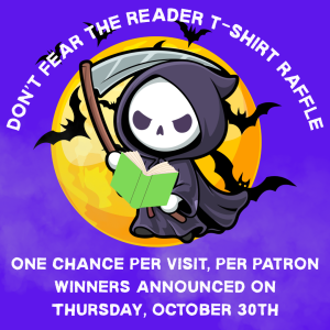 Don’t fear the reader raffle, or the Library staff! For the past several weeks you may have noticed Library staff walking around with “Don’t Fear The Reader” t-shirts. We love these t-shirts so much that we are hosting a free raffle to win one of these shirts. We will announce the winners on Thursday, October 30th. It is one chance per patron, per visit.