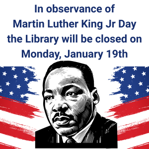 In observation of Martin Luther King Jr. Day the Library will be closed on Monday, January 19th. We will reopen for normal business hours on Tuesday, January 20th, starting at 9:30 am. The book drop will remain open.