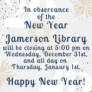 In observation of the New Year Holiday the Library will be closing on Wednesday, December 31st at 5:00 pm, and closed all day on Thursday, January 1st. We will reopen for normal business on Friday, January 2nd, starting at 9:30 am. The book drop, located at the back of the building, will remain open.