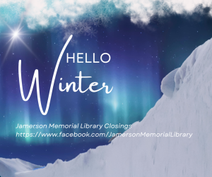December has already brought a wintery mix and snow, with more winter weather on the way. Please follow us on Facebook for the latest Library Closings at: https://www.facebook.com/JamersonMemorialLibrary . The safety of our patrons come first, so please use caution when thinking about traveling in bad weather. Don’t forget that we offer online services like Libby, Kanopy, Just for Kids (videos), and lots more on our website: www.jrjml.org . If you need to renew your materials or have any other questions, call us at 434.352.5340.