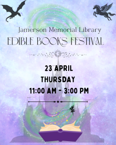 Put a book in your mouth! Coming up on Thursday, April 23rd, the Library will be hosting its annual Edible Books Festival from 11:00 AM to 3:00 PM — and you won’t want to miss it! This beloved and deliciously creative event invites participants of all ages to craft edible art projects inspired by a book, story, or literary character. Think cake, chocolate, breadsticks, veggies, and everything in between — if it’s edible and book-themed, it qualifies! Entries will be judged on originality and creativity, skill and construction, visual appeal, and how well the creation ties in with its literary inspiration. Awards will be presented in four categories: Best of Show Adult Book, Best of Show Young Adult Book, Best of Show Children’s/Juvenile Book, and People’s Choice. Whether you’re a book lover, a creative baker, or just someone who appreciates a great pun, now is the time to start planning your masterpiece! For contest rules and to complete your official entry form, visit us at the Library or check out www.jrjml.org. You can also give us a call at 434-352-5340 during normal business hours. We can’t wait to see what you cook up!