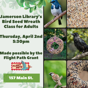 Jamerson Library’s Bird Seed Wreath Making Class for Adults. Join the Bird Seed Wreath Making Class for Adults on Thursday, April 2nd at 5:30 pm in the library conference room. Learn to create two take-home bird seed wreaths using bird seed, oatmeal, and cranberries to feed local and migrating birds.
