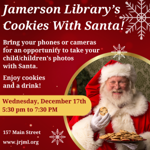 Jamerson Library’s Cookies With Santa! Parents and guardians bring the kids out to meet Santa Claus! Enjoy cookies and juice or milk in the community room from 5:30 pm to 7:30 pm. Don’t forget to bring a camera or your phone to capture some great family memories at the local Library!