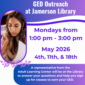 GED Outreach @ the J. Robert Jamerson Memorial Library. From 12:00 pm–3:00 pm, Doriane Mills from the Adult Learning Center will be at the Library to answer your questions and help you sign up for classes to earn your GED.