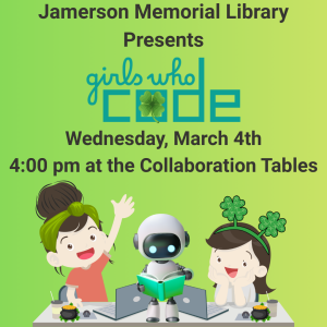 Girls Who Code at the Jamerson Library starting at 4:00 pm in the community room. Girls Who Code is a club designed to help young women learn about science, technology, engineering, and math and how they integrate into their everyday lives. The Jamerson GWC club welcomes new members from 3rd grade to 12th grade. Please register at https://www.jrjml.org/girlswhocoderegistration/.