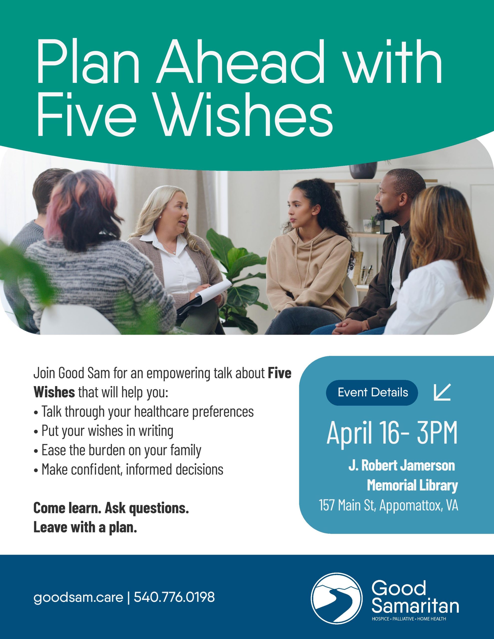 Good Samaritan Hospice’s discussion on “Plan Ahead with Five Wishes” at the Jamerson Memorial Library, starting at 3:00 pm in the Library’s conference room. Good Samaritan Hospice will host an empowering seminar to help you talk through your healthcare preferences, put your wishes in writing, ease the burden on your family, and make confident, informed decisions. Come learn, ask questions, and leave with a plan.