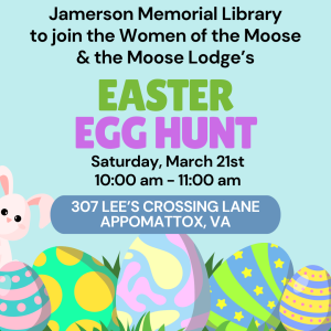 Jamerson Library to join the Moose Lodge for their Easter Egg Hunt from 10:00 am to 11:00 am. The Library will be inside with crafts, coloring pages, and Library information. The Moose Lodge is located at 307 Lee’s Crossing Lane, Appomattox, VA.