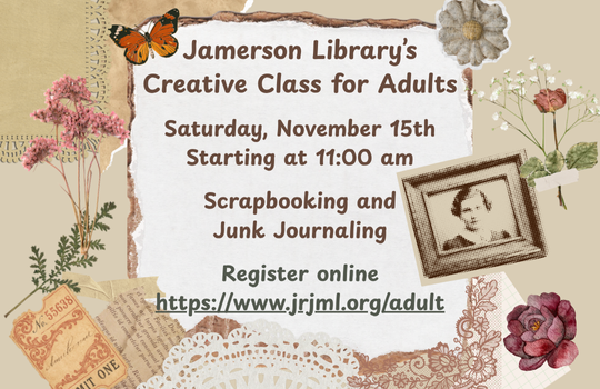 Jamerson Library’s Creative Class for Adults starting at 11:00 am in the community room. This month we will be introducing patrons 18+ years of age the art of scrapbooking and junk journaling. Just in time for the upcoming holidays, learn how to turn your photos and memorabilia into fun and crafty pages using fancy papers, stickers, glue, punches, and other embellishments to create your very own photo album / junk journal. You must be registered at: https://www.jrjml.org/adult-program-registration/ to attend.
