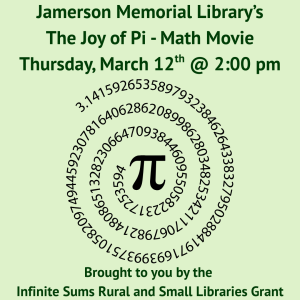 Jamerson Library’s Math Movie starting at 2:00 pm in the community room. We will feature “The Joy of Pi”, a part of the Kanopy series The Joy of Mathematics. Pi is the ratio of the circumference of a circle to its diameter. It starts at 3.14 and continues in an infinite nonrepeating sequence. Professor Benjamin shows how to learn the first hundred digits of this celebrated number, making it look as easy as pie. Brought to you by the Infinite Sums Rural and Small Libraries Grant.