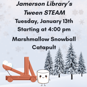 Jamerson Library’s Tween STEAM Program starting at 4:00 pm in the community room. It’s a marshmallow world as we make catapults to launch pom poms and marshmallows! Enjoy eating and launching these fluffy and soft missiles of sweetness at your friends and family. Don’t eat the pom poms! We will provide all needed supplies and snacks!