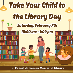 Take Your Child to the Library Day from 10:00 am to 1:00 pm at the Jamerson Library. A perfect way to spend a Saturday, at your local Library! Enjoy snacks and crafts as you explore the world of books and beyond! Enter into a world of magic, science, displays, and more! Be sure to apply for a Library card or update an existing one.