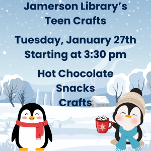 Jamerson Library’s Teen Crafts starting at 3:30 pm in the community room. Join us for assortment of winter crafts, hot chocolate and snacks.