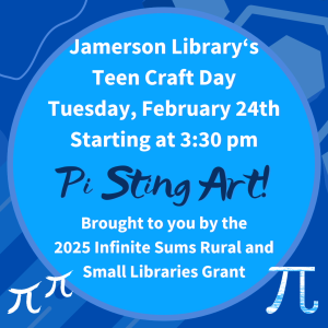 Jamerson Library Teen Crafts with MaKayla starting at 3:30 pm in the community room. Join us for Pi string art and snacks! Brought to you by the Infinite Grant! Everyone is welcome to attend with the understanding that this even is for teenagers. Brought to you by the Simons Foundation Infinite Sums Grant!