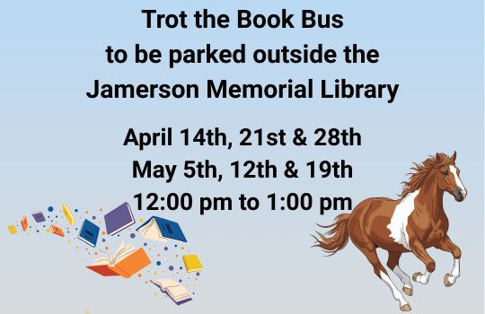Trot the Book Bus at the Jamerson Library from 12:00 pm to 1:00 pm. All aboard the pony express! Preschool through high school-aged youth can borrow a book from this horse-painted bus that will be parked out front of the Library, located on Main Street. The Library accepts book returns and donations on behalf of Trot year-round.