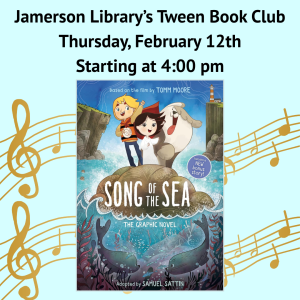 Jamerson Tween Book Club starting at 4:00 pm in the Library’s community room. Introducing our new Tween Book Club featuring the graphic novel “Song of the Sea” by Samuel Sattin. A lush graphic novel about a family adrift and the magical adventure that brings them together. Many years after the disappearance of their mother, siblings Ben and Saoirse are still drowning in grief, as is their lighthouse-keeper father. Ben blames his little sister for the loss of their mother, and despite being six years old, Saoirse has yet to speak. When the kids discover that Saoirse is a selkie and the magical world that their mother told stories about is real, they dive into an adventure to keep the spirit world from disappearing forever. Based on the award-winning film Song of the Sea, this graphic novel is a wonder of magical storytelling and visual splendor that is destined to become a classic. There are multiple copies of this book available at the circulation desk.