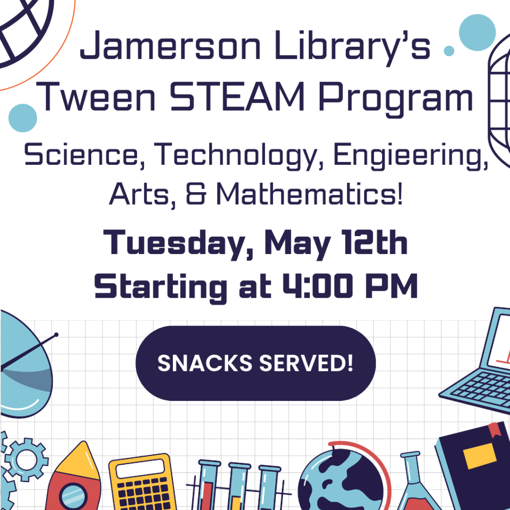 Jamerson Library STEAM Program starting at 4:00pm inside the community room. Learn about plants while enjoying crafts and snacks with Library Fairy MaKayla. This program is for elementary and middle school age students who want to have fun with Science, Technology, Engineering, Art, and Math – STEAM!