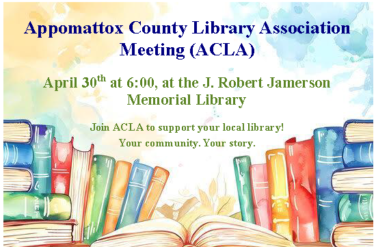 The Appomattox County Library Association will be holding an interest meeting on April 30, 2026 at 6:00 PM in the Community Room of the Jamerson Memorial Library. Please come out and find out how you can help your local library.