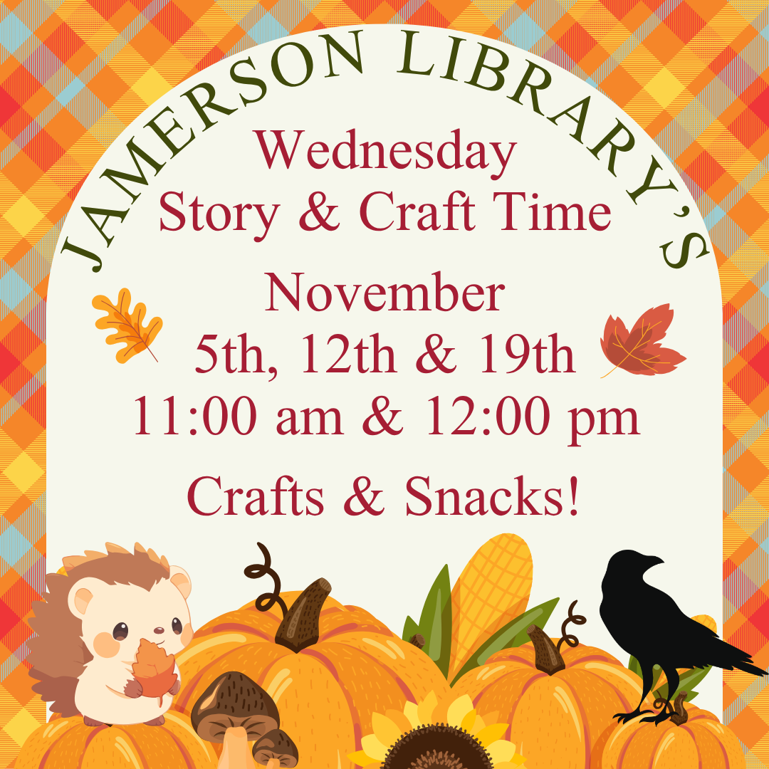 November 12, Wednesday - Preschool Story & Craft Time at the J. Robert Jamerson Memorial Library starting at 11:00 am and 12:00 pm. The Library will feature an age-appropriate book followed by a simple craft project and snacks. Everyone is welcome to attend with the understanding that this program is intended for preschool patrons.